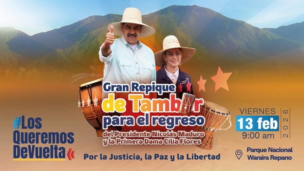 inicio sobre nosotros comunicados noticias Opinión y Análisis galería inicio sobre nosotros comunicados noticias Opinión y Análisis galería Gran Repique de Tambor por el regreso del Presidente Nicolás Maduro y la Dama Cilia Flores Caracas, 12 de febrero de 2026.- Este viernes 13 de febrero a las 9:00 de la mañana el Waraira Repano retumbará con el Gran Repique de Tambor por el regreso del Presidente Nicolás Maduro Moros y la Primera Dama, diputada Cilia Flores. El Instituto Simón Bolívar para la Paz y la Solidaridad entre los Pueblos convoca a esta jornada combativa en el marco de la Campaña Nacional Bring Them Back, #LosQueremosDeVuelta. La actividad contará con una ceremonia de sanación mística a cargo de Noelí Pocaterra, con la participación del Canciller de la República Yván Gil, la presidenta del la Paz y la solidaridad entre los Pueblos, Blanca Eekhout, la diputada Casimira Monasterio del Movimiento Cumbe y una vocería por la juventud de la Patria. Habrá décimas, sangueo popular, repique de tambor por la liberación y agitación de pancarta al grito de: “¡Repiquen, repiquen, repiquen los tambores, liberen a Maduro y también a Cilia Flores!” Invitación para todo el público en general para que retumbe el Waraira Repano por la libertad.